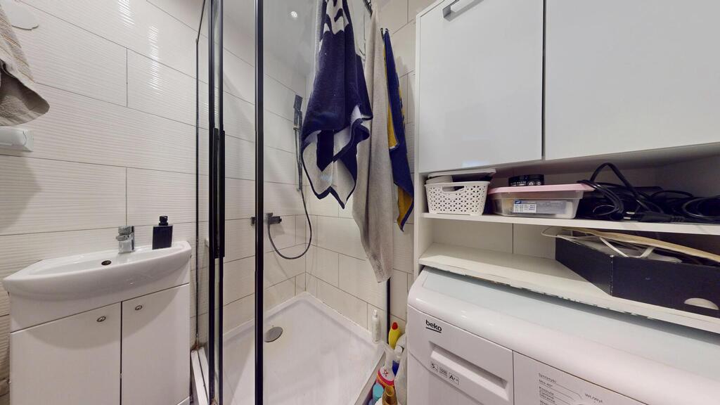 - łazienka w glazurze i terakocie, wyposażona w kabinę prysznicową,