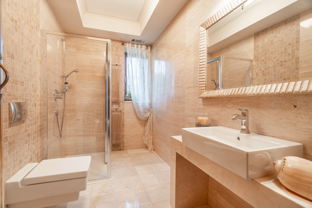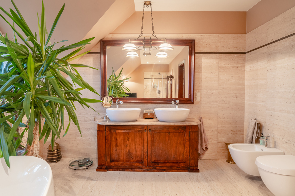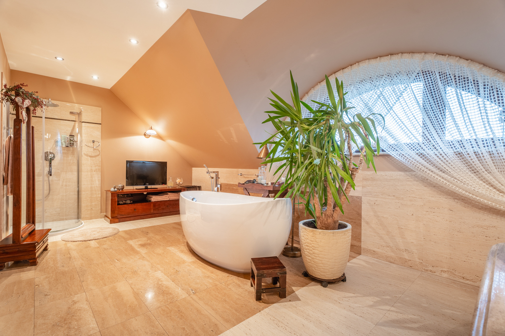 ・Luxury bathroom (bathtub, shower) – underfloor heating + stunning "bull’s-eye" style window