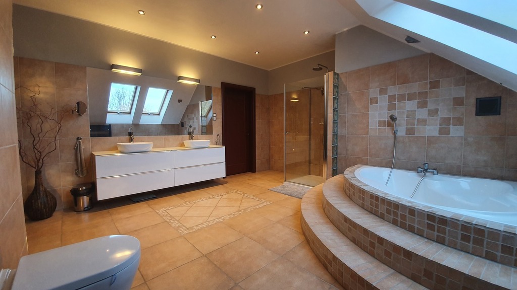 - duża łazienka z prysznicem, wanną i WC oraz wydzieloną pralnią - 18,2 m2