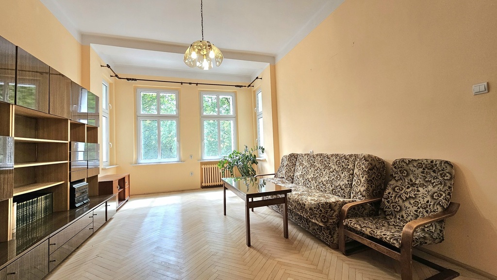 Jasny salon z dużymi oknami i oryginalnym parkietem. Idealny do wypoczynku lub stworzenia eleganckiej przestrzeni reprezentacyjnej.