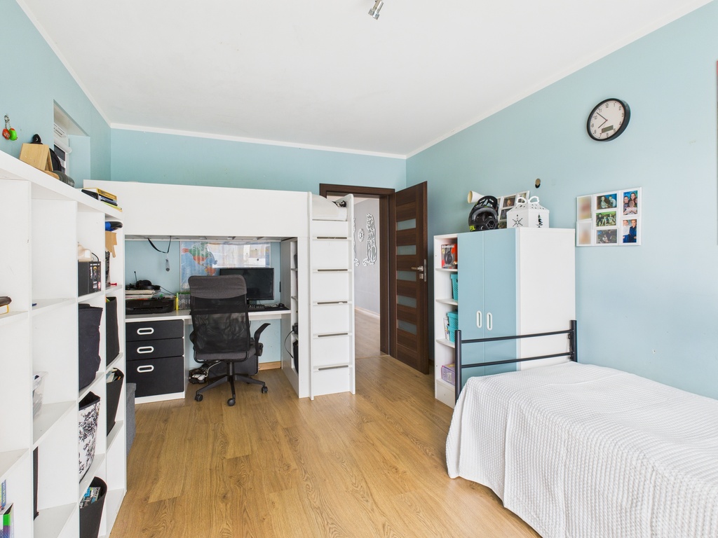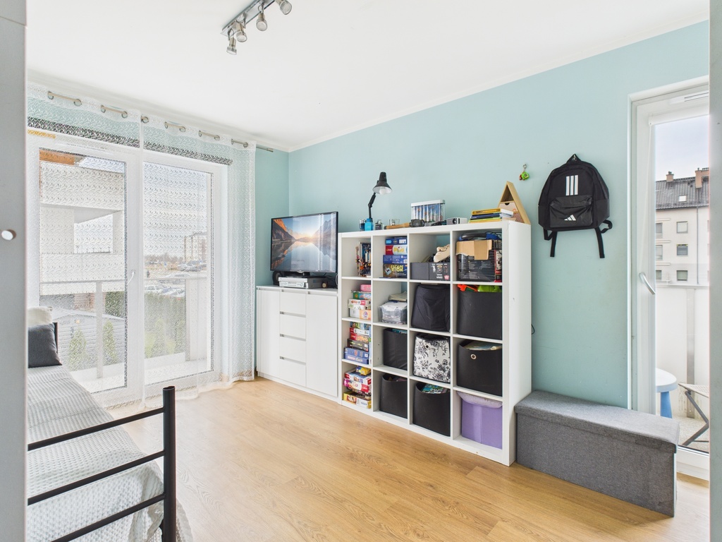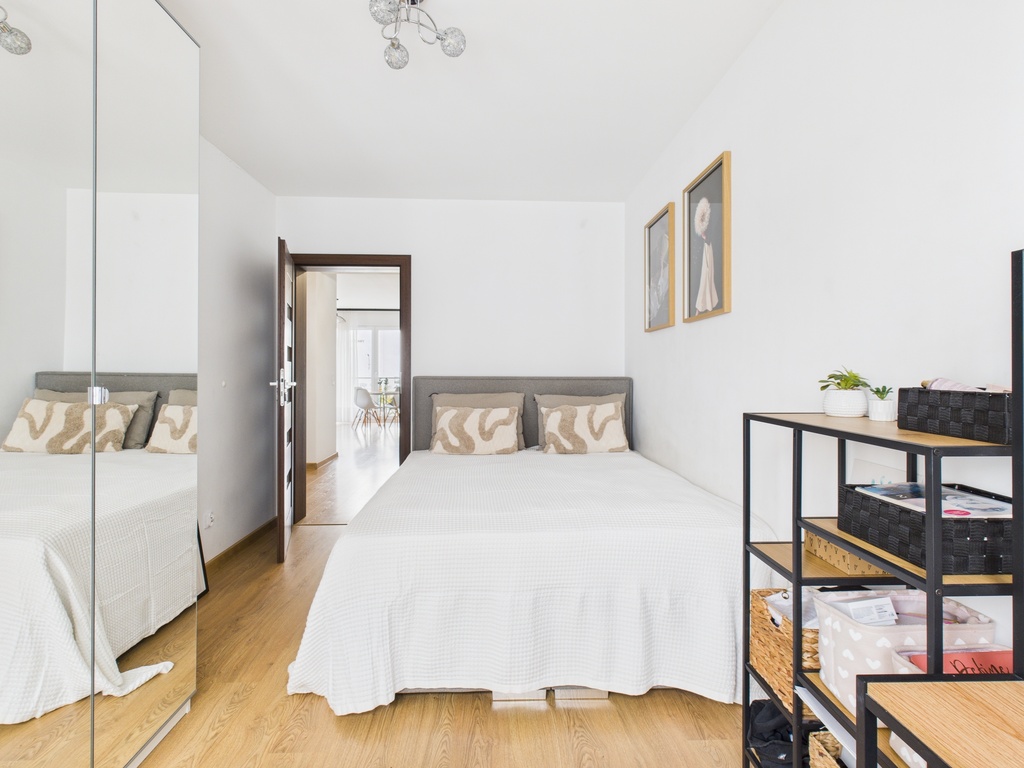Mieszkanie posiada dwie ustawne sypialnie, które z łatwością można zaaranżować jako komfortową sypialnię główną, pokój dziecięcy lub gabinet do pracy zdalnej.