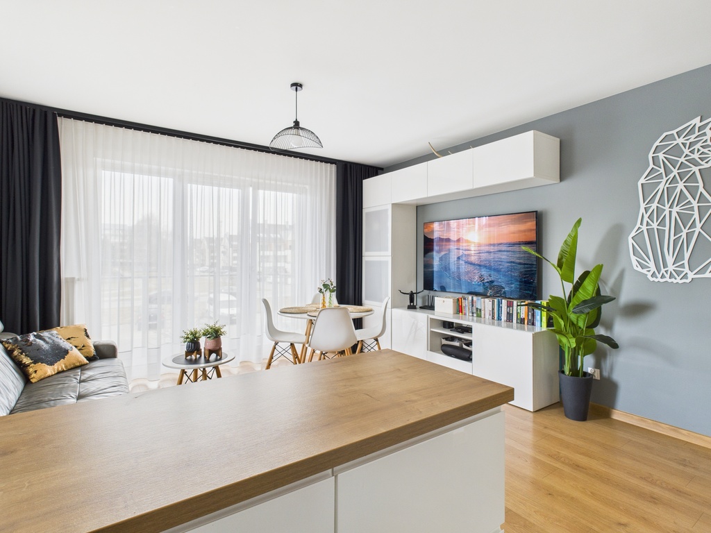 Lokal został zaprojektowany z myślą o wygodzie codziennego życia – centralnym punktem mieszkania jest przestronny salon z otwartą kuchnią, który tworzy jasną i przyjazną przestrzeń do wspólnego spędzania czasu z rodziną i przyjaciółmi.