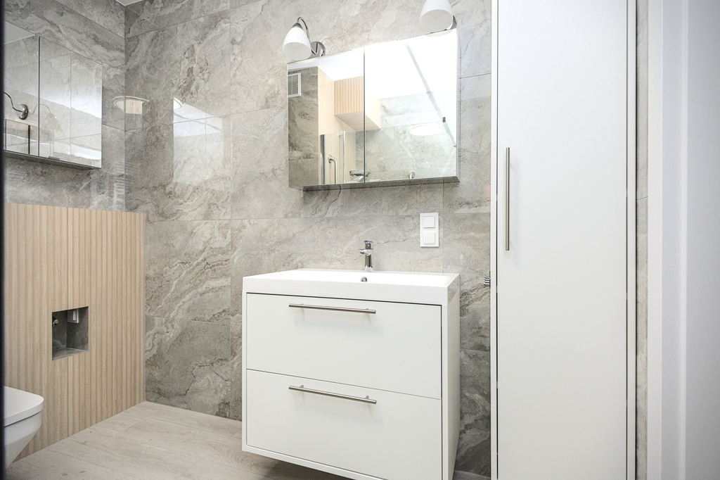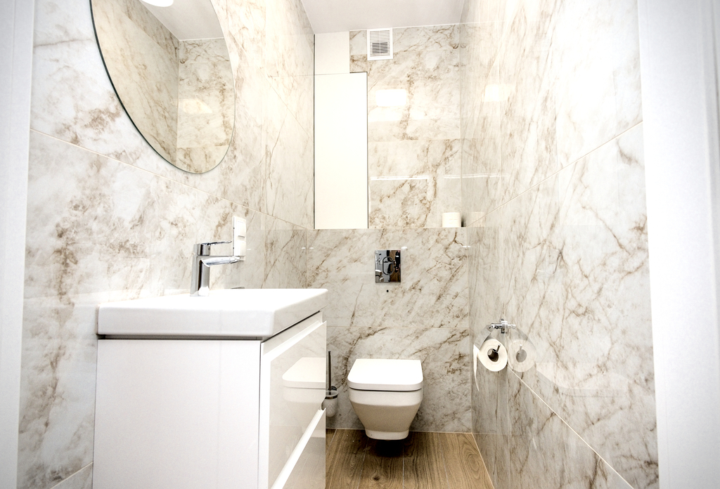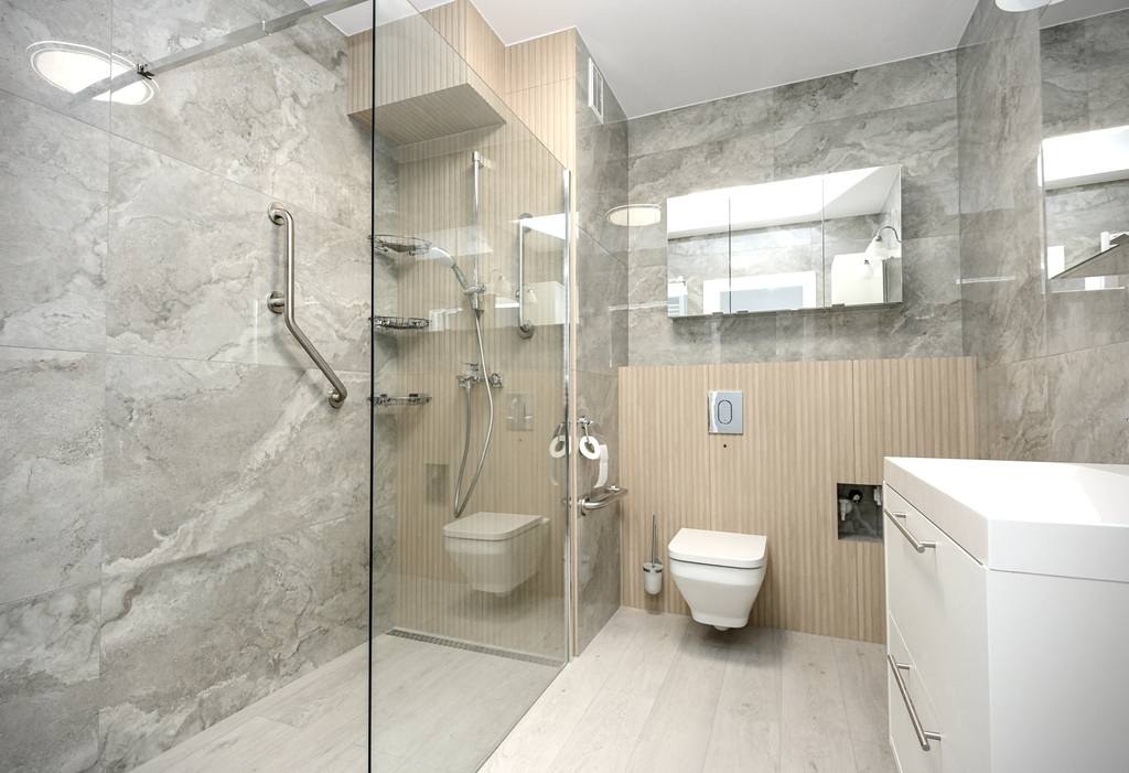 Łazienka z WC: Nowoczesna, zaprojektowana z myślą o maksymalnej wygodzie, przystosowana także dla osób niepełnosprawnych.