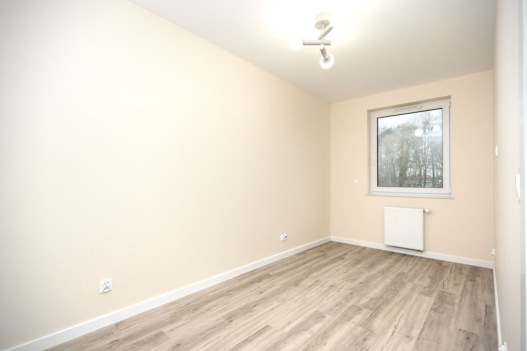 W lokalu położono panele, wygładzono oraz pomalowano ściany, zamontowano drzwi wewnętrzne oraz wyposażono łazienkę i kuchnię.