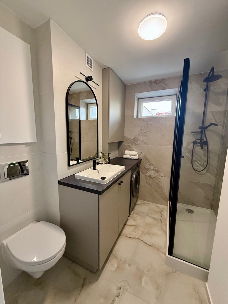 * łazienki (4m2) z umywalką, kabiną prysznicową , wc oraz zabudową na wymiar.