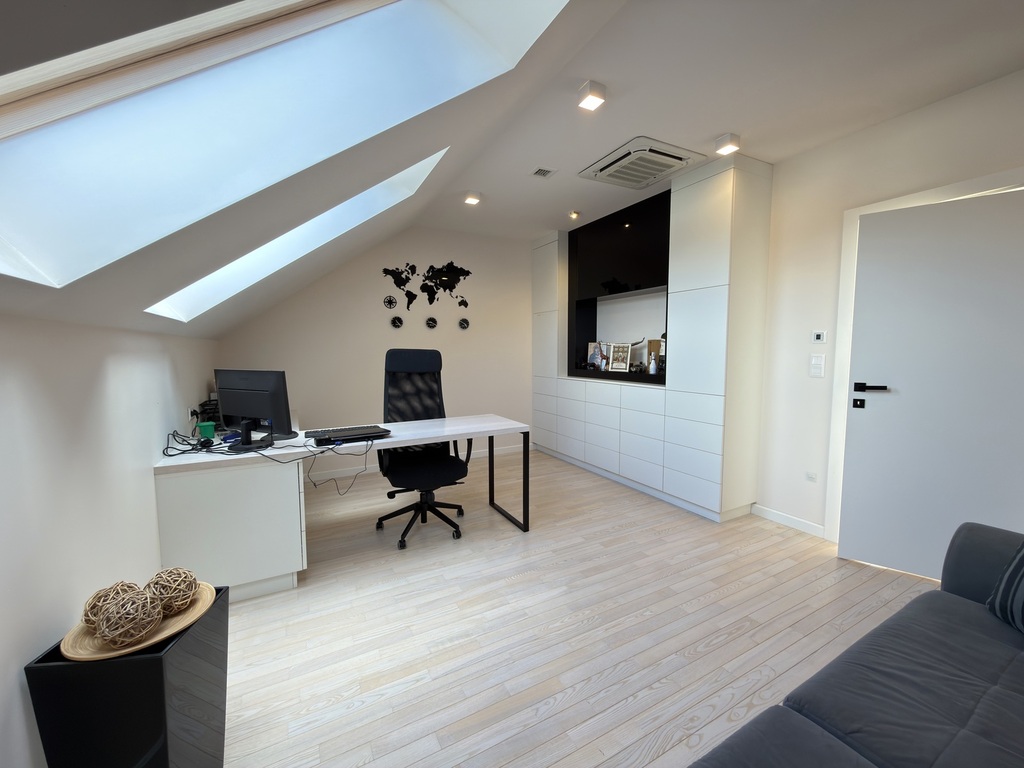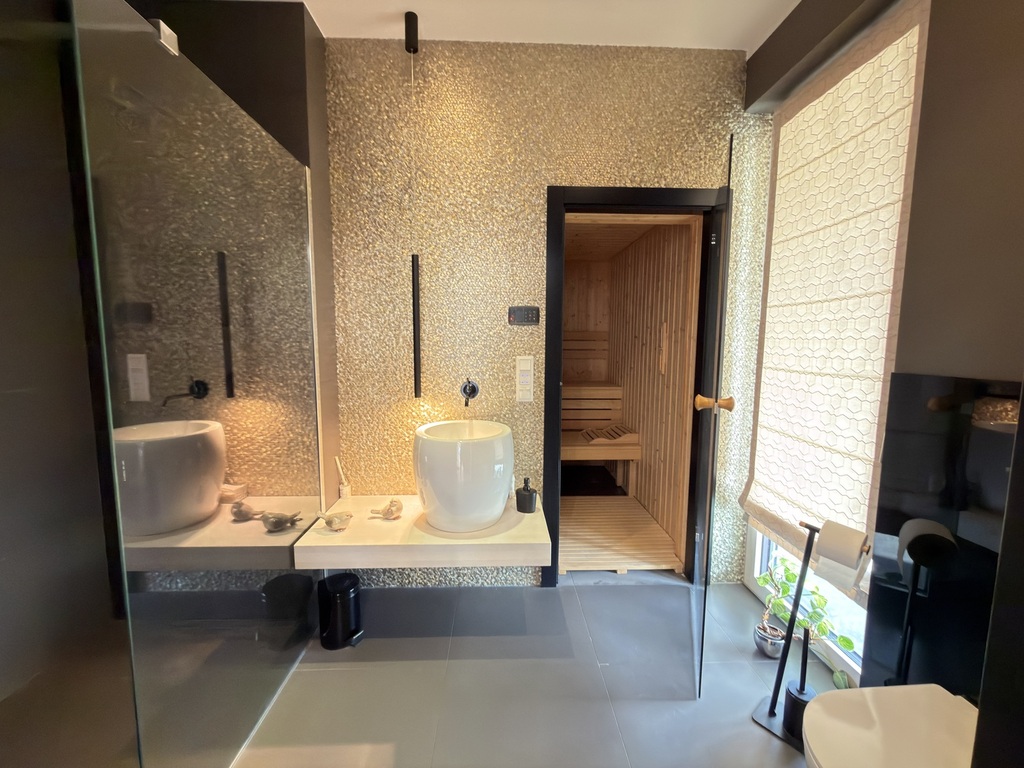 Dla miłośników relaksu przygotowano prywatną saunę, która pozwala na codzienny wypoczynek w domowym zaciszu. Całość uzupełnia nowoczesne wejście z czytnikiem linii papilarnych, podkreślające prestiż i bezpieczeństwo nieruchomości. Zastosowane zostały również żaluzje fasadowe.