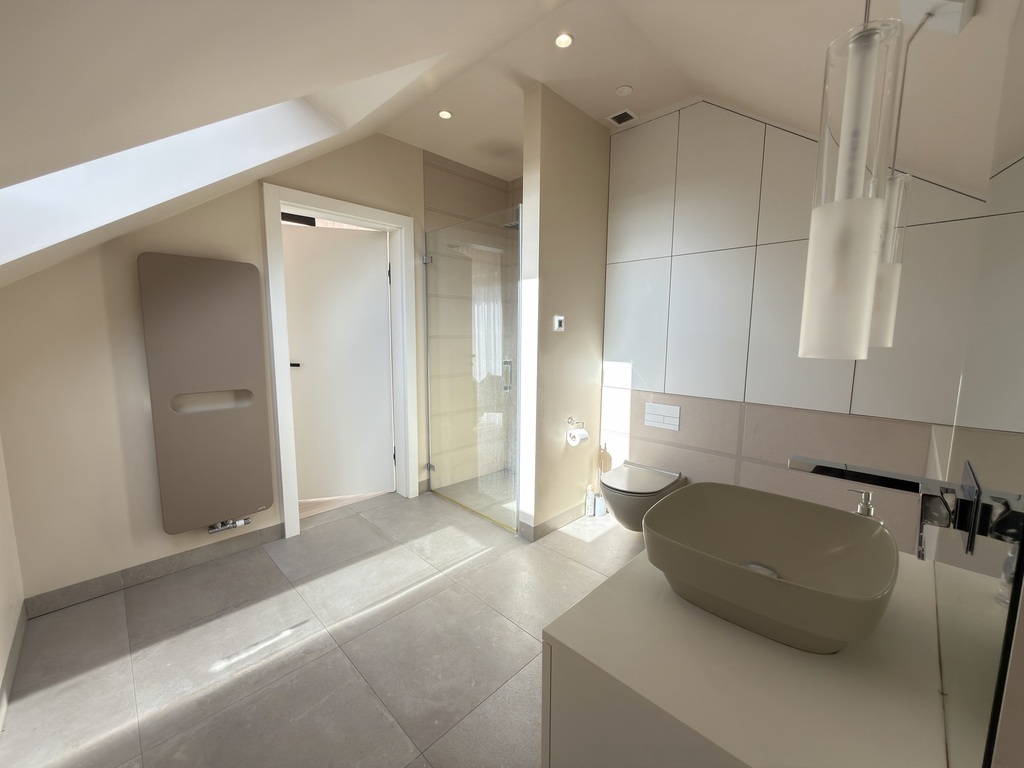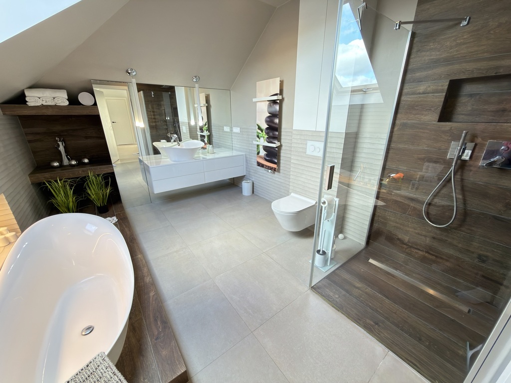 Wnętrze domu zostało wykończone z najwyższej jakości materiałów – na podłogach znajdują się eleganckie gresy oraz naturalne drewno, które razem tworzą harmonijną i ponadczasową kompozycję. Komfort użytkowania podnosi ogrzewanie podłogowe w całym budynku, zasilane instalacją gazową, a także nowoczesna rekuperacja zapewniająca świeże powietrze przez cały rok.
