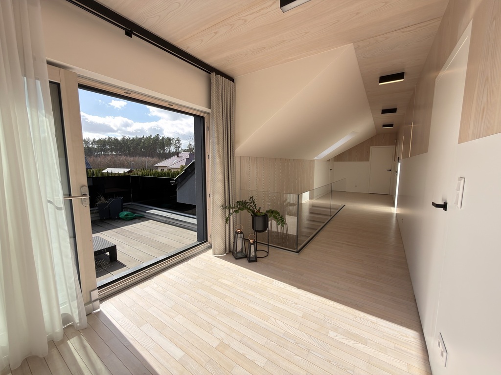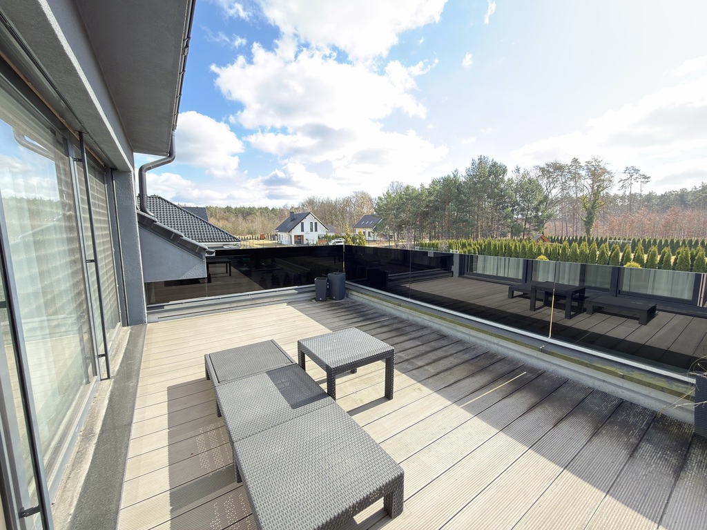 Z piętra wyjście na duży taras z widokiem na ogród.