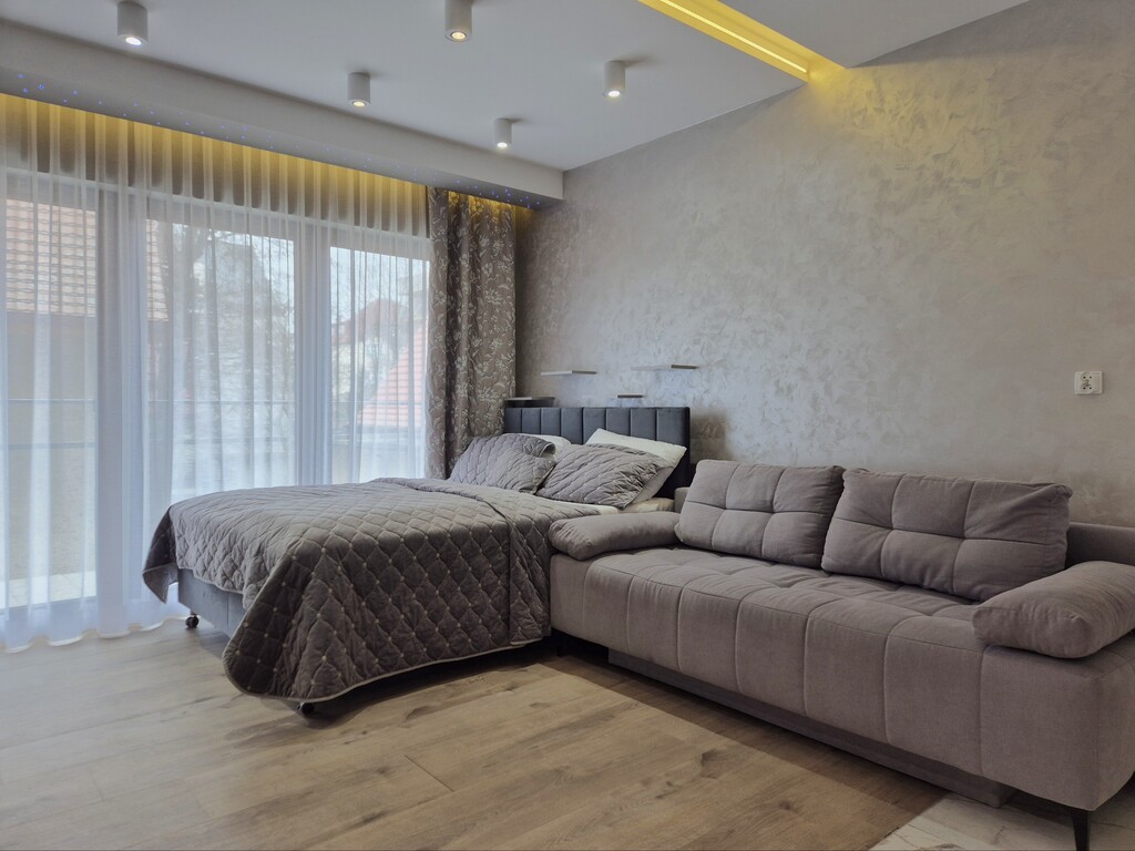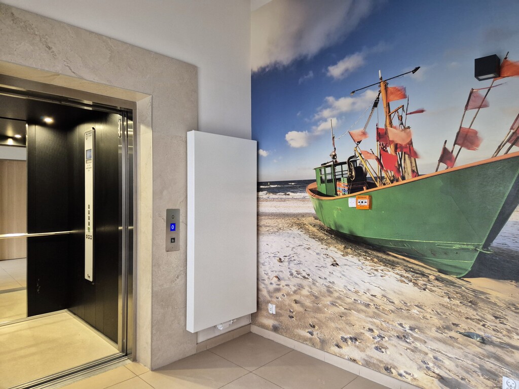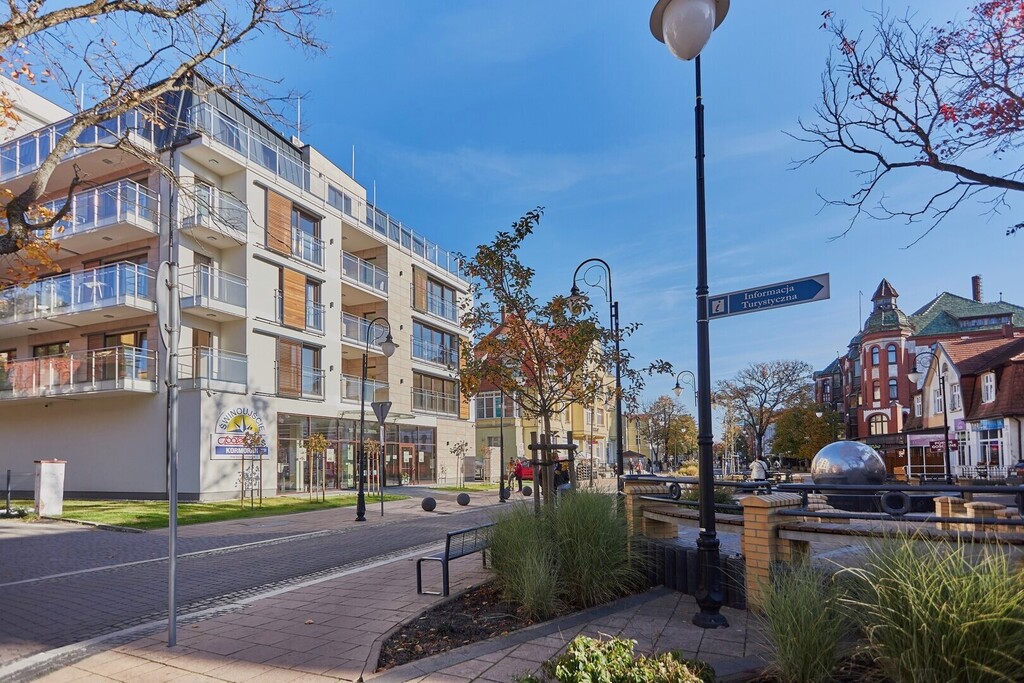 Apartament usytuowany jest na 1. piętrze nowoczesnego budynku z 2020 roku położonego w strefie uzdrowiskowej przy ulicy zamkniętej dla ruchu samochodów, wyposażonego w windę, co zapewnia komfort codziennego użytkowania.