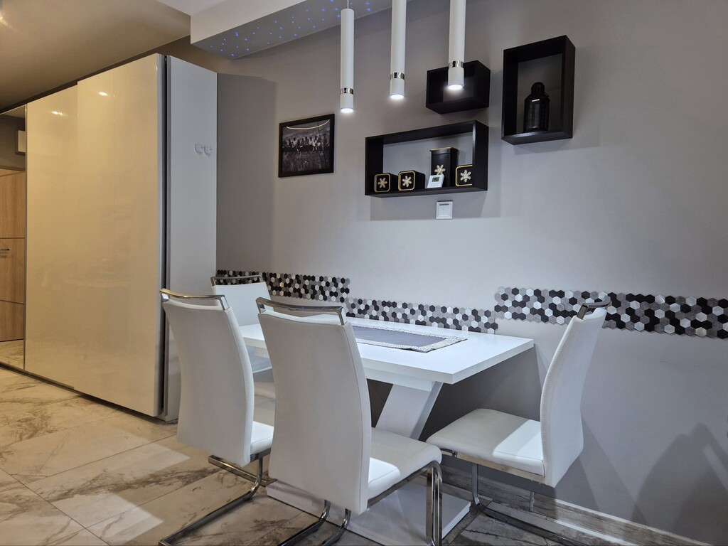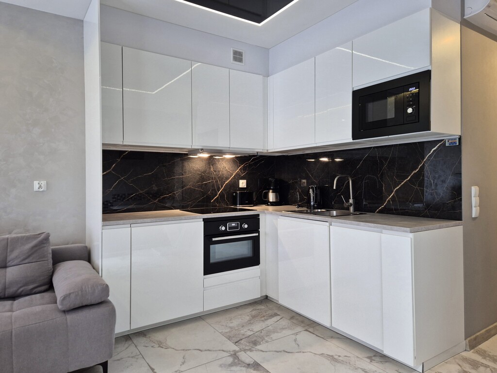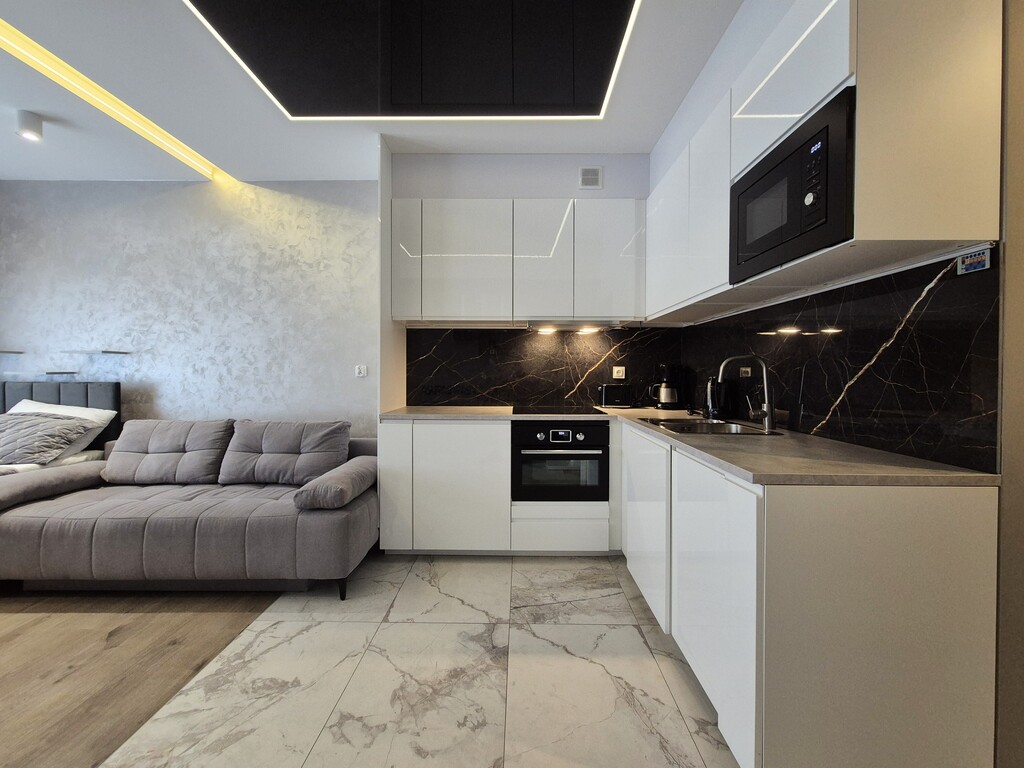 Wykonany na zamówienie z wysokiej klasy zabudową meblową. W pełni wyposażony w sprzęt AGD: płytę indukcyjną, piekarnik, lodówkę, zmywarkę oraz kuchenkę mikrofalową.