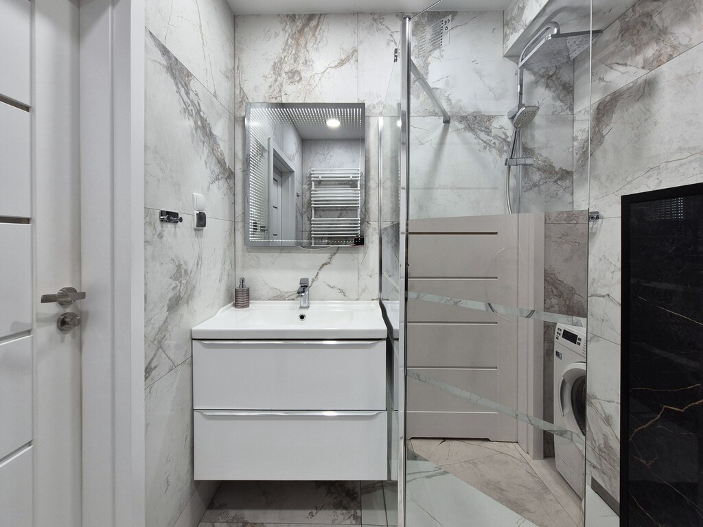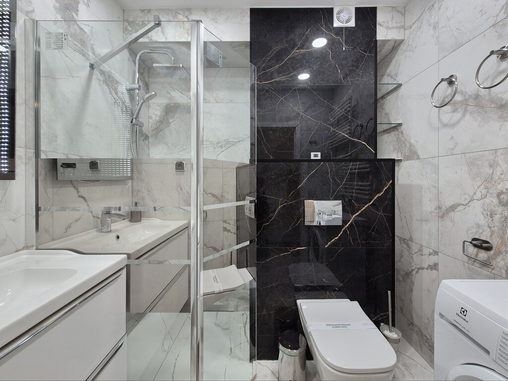 Wyposażona w kabinę prysznicową, WC podtynkowe, umywalkę oraz pralkę – wszystko w estetycznym i funkcjonalnym wydaniu.