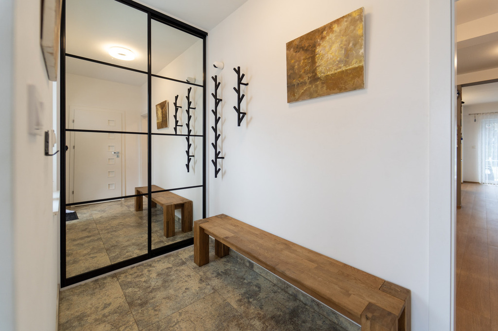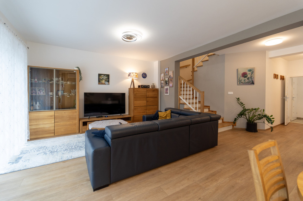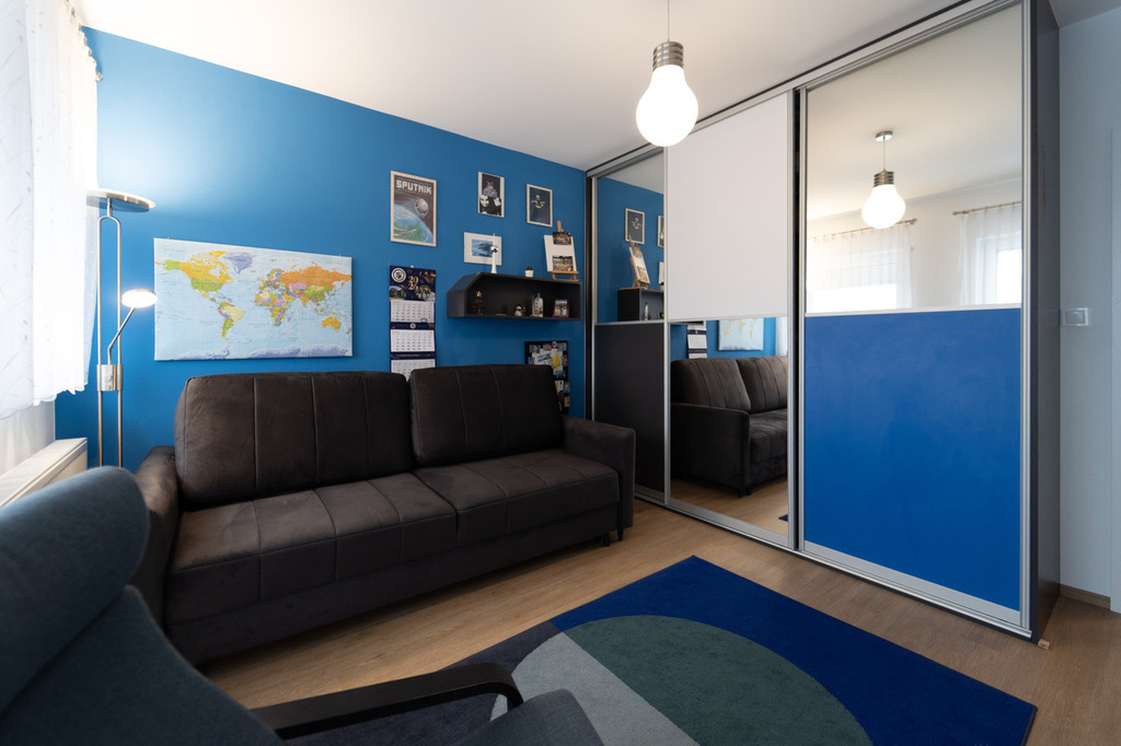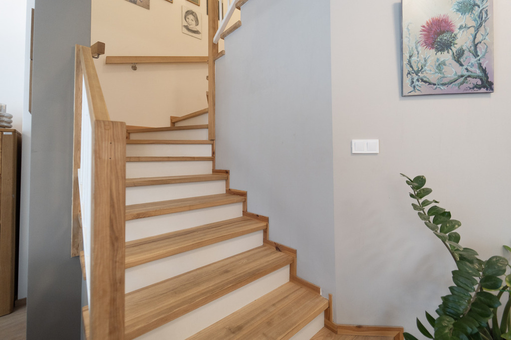 - Wysoki standard wykończenia: panele winylowe, solidne schody jesionowe, zabudowy i szafy na wymiar.