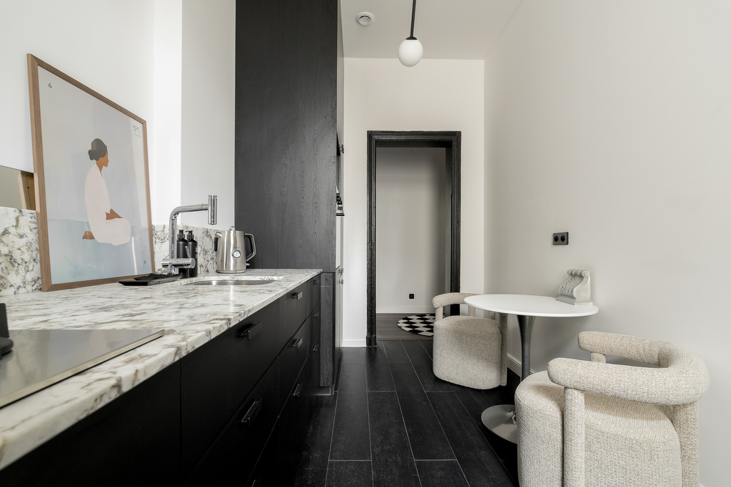 Szlachetność Materiałów: Z pietyzmem odrestaurowano oryginalne drewniane podłogi, które teraz lśnią naturalnym ciepłem. Nad głowami dumnie prezentują się odnowione sztukaterie. Płaszczyzny użytkowe to z kolei trwałość natury: granitowe parapety w całym mieszkaniu oraz blaty z białego granitu w kuchni i łazience.
