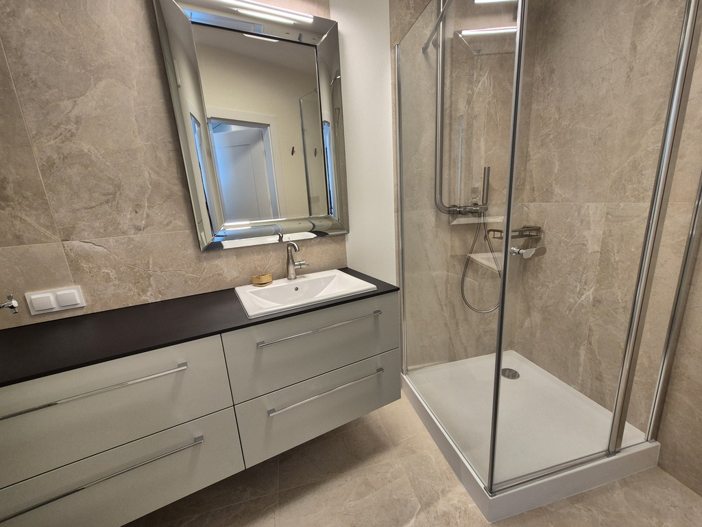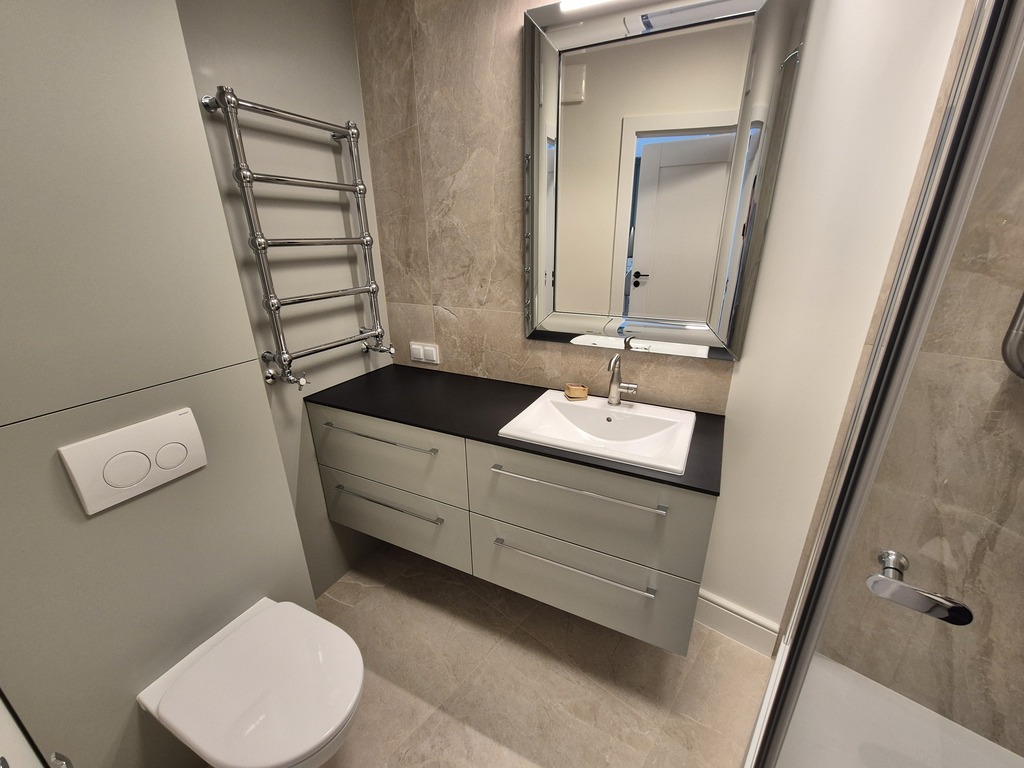Apartament, który oferujemy, znajduje się na pierwszym piętrze. Posiada 45,74m2 powierzchni i duży 8m2 balkon. Okna wychodzą na stronę południową, co przy dużych panoramicznych oknach daje dużo światła dziennego. Salon z aneksem kuchennym to 21m2 pięknie urządzonej przestrzeni z meblami na wymiar. Każdy centymetr przestrzeni wykorzystany w pełni. W zabudowie kuchennej mamy wszelkie niezbędne sprzęty: lodówka, zmywarka, piekarnik z mikrofalówką, pralka i suszarka. Sypialnia o powierzchni 15m2 to miejsce w którym możesz komfortowo odpocząć. Ten pokój został umeblowany w wygodne dwuosobowe łóżko, dużą zabudowaną szafę na wymiar oraz biuro do pracy. Łazienka z WC o powierzchni 4,21m2 posiada kabinę prysznicową i umywalkę.