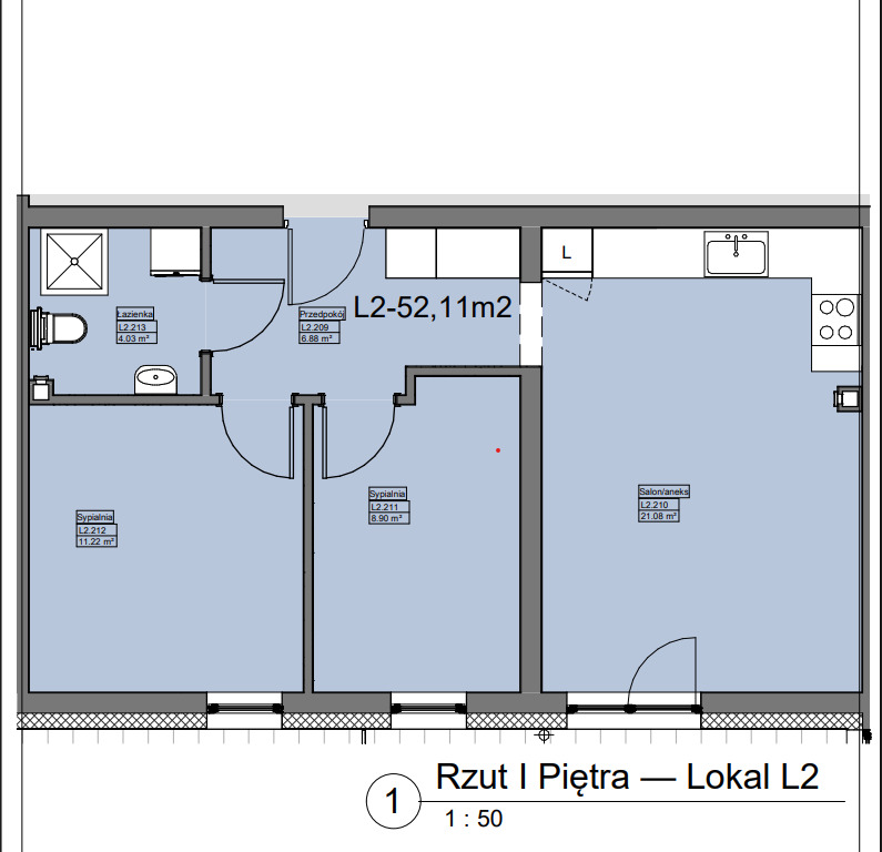 - przestronnego salonu z aneksem kuchennym (21,08 m²)