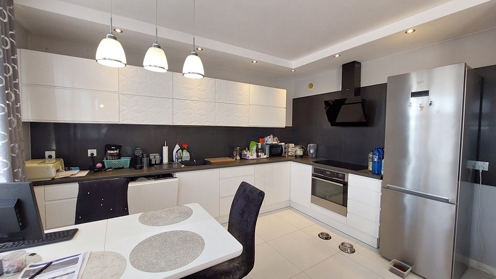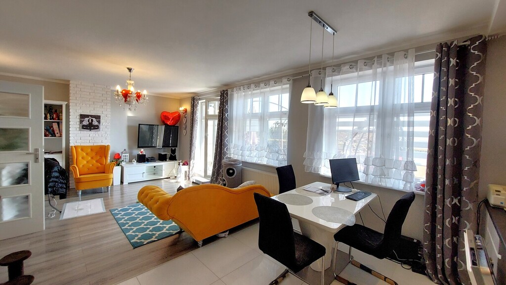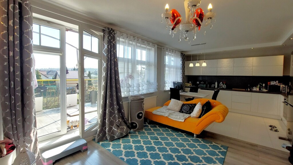 - wielki salon z aneksem kuchennym oraz wyjściem na duży i słoneczny taras z widokiem na ogródki działkowe,