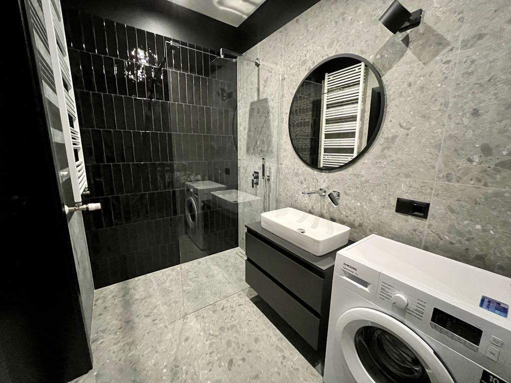 Łazienka urządzona nowocześnie z prysznicem wyposażonym w odpływ liniowy.
