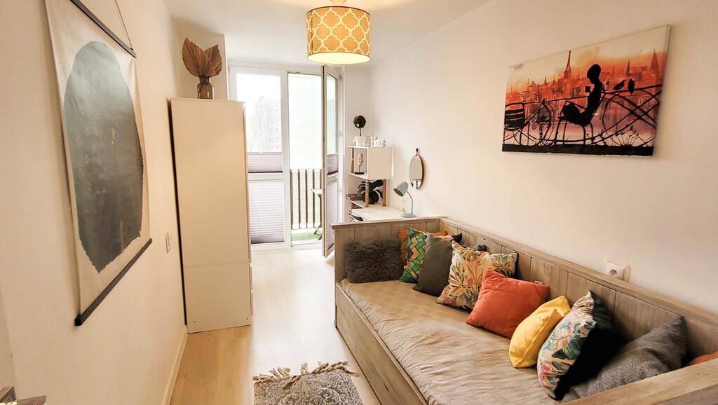 Liczba pokoi: 3 (1 pokój z balkonem, 1 pokój przechodni przez salon)