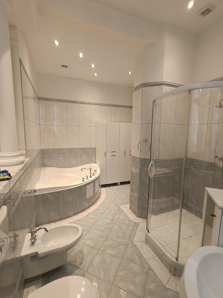 - łazienka z oknem, wyposażona w wannę, kabinę prysznicową, bidet oraz toaletę,
