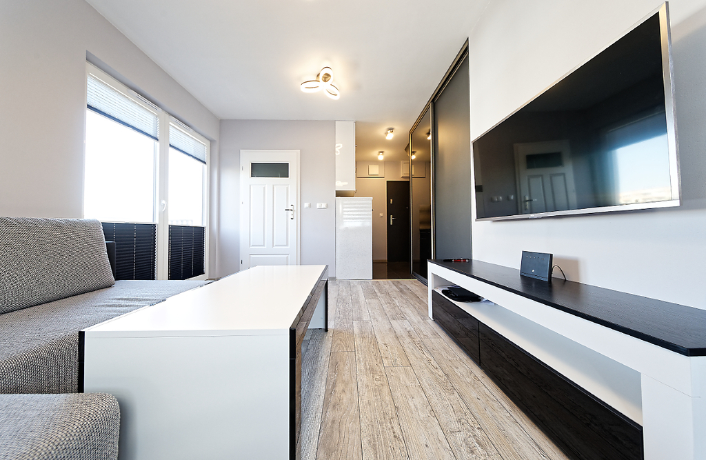 Na I poziomie znajduje się przestronny salon z aneksem kuchennym, łazienka z wc oraz balkon usytuowany od strony wschodniej. Na drugim poziomie jest sypialnia z wyjściem na balkon od strony południowej.