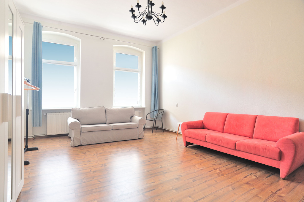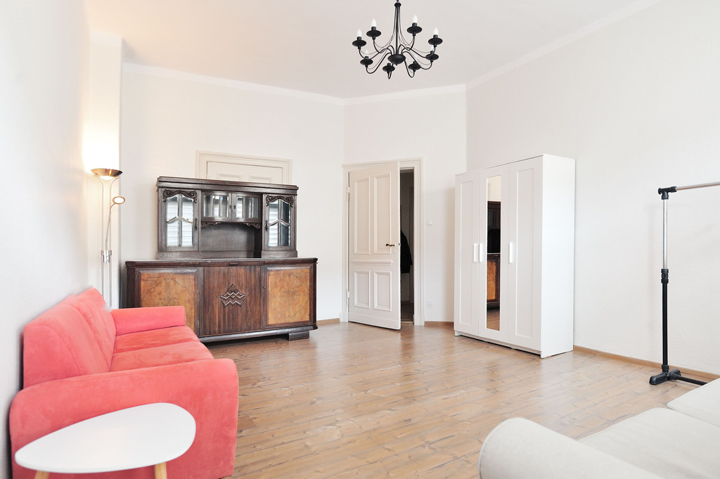 OPIS POKOJU: Do wynajęcia pokój o powierzchni ok. 20m2 znajdujący się w mieszkaniu położonym na drugim piętrze IV-piętrowej kamienicy. Pokój wyposażony jest w kanapę, stolik, wieszak na ubrania oraz komodę. Dodatkowo dostawiona została biała szafa na ubrania, która nie jest widoczna na zdjęciu.