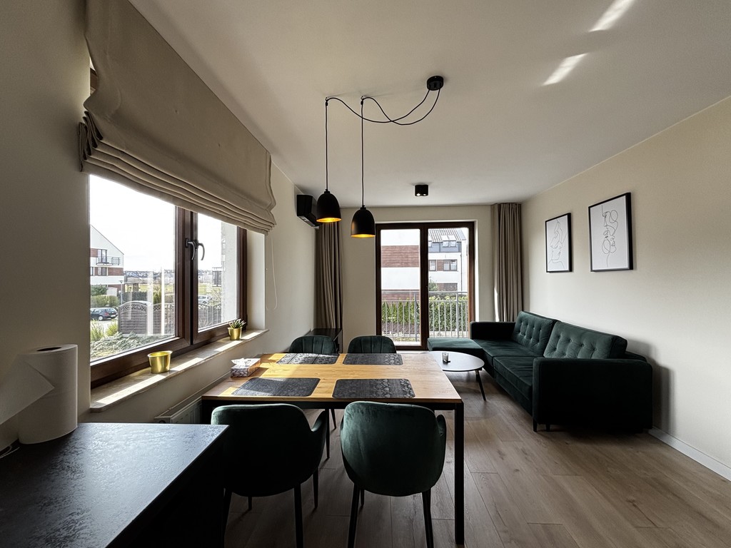 W ofercie sprzedaży mieszkanie zlokalizowane na zamkniętym osiedlu na pograniczu Gumieniec i Warzymic.