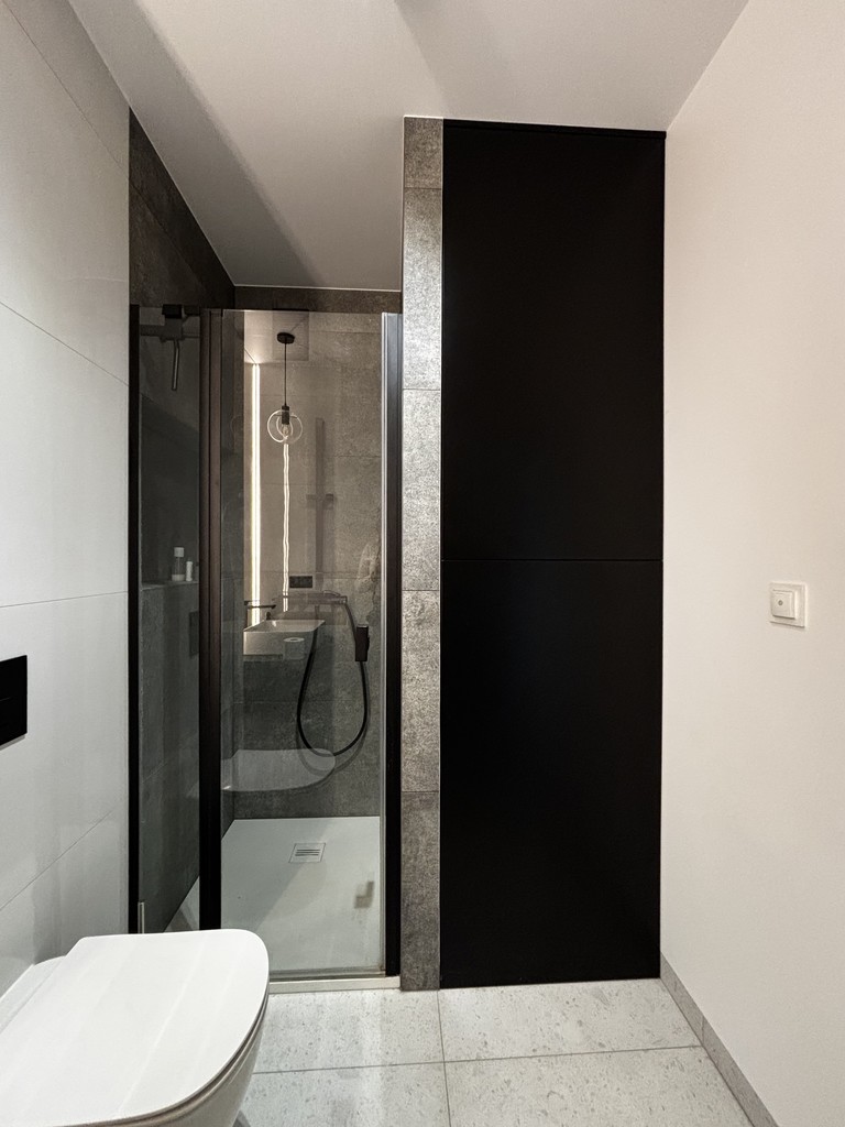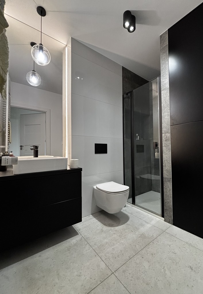 Łazienka połączona z toaletą, wykończona gresem, na wyposażeniu kabina prysznicowa, umywalka, lustro podświetlane, pralka, zabudowa stała na wymiar.
