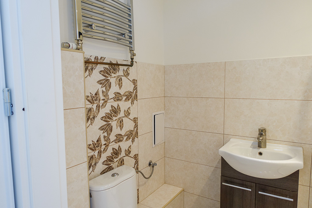 * W łazience glazura i terakota, nowa kabina prysznicowa z armaturą. Nowe piony.