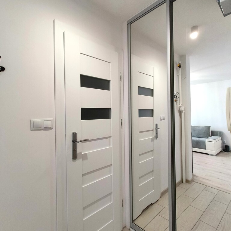 -przedpokój z szafą typu komandor z lustrzanymi drzwiami