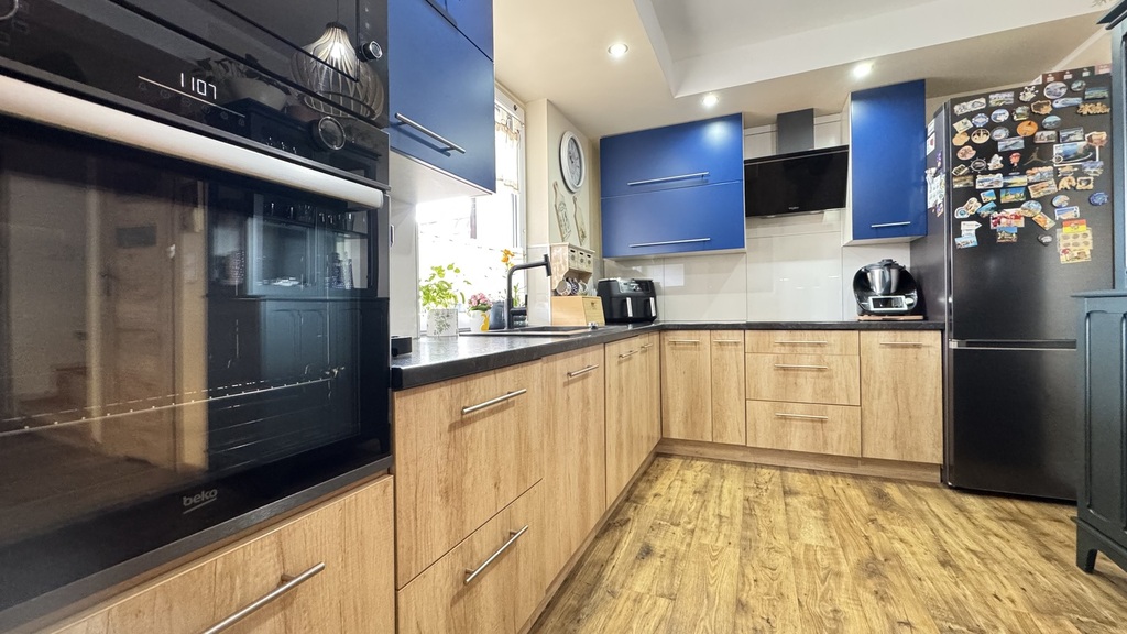 Budynek jest w pełni podpiwniczony — a piwnica o powierzchni 52,90 m² to prawdziwe zaplecze domu. Znajduje się tu kuchnia robocza z szafami pod zabudowę na całej długości, kotłownia, spiżarnia oraz pomieszczenie gospodarcze. Funkcjonalność na najwyższym poziomie.