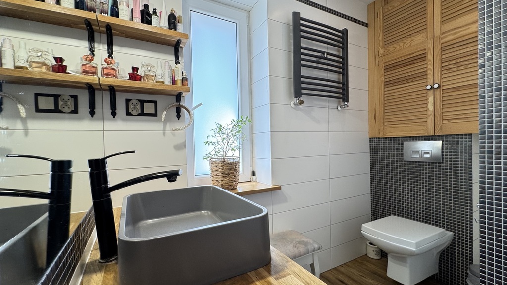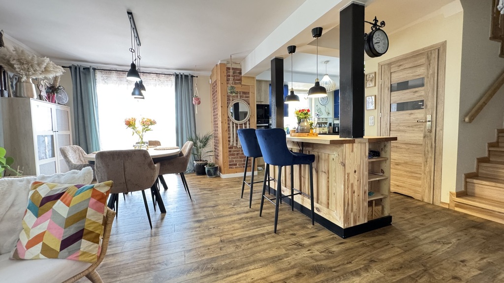Serce domu to otwarty salon połączony z jadalnią i kuchnią o industrialno-rustykalnym charakterze — drewniana wyspa kuchenna, czarne akcenty, cegła, pendant lampy i mnóstwo naturalnego światła wpadającego przez duże okna. Kuchnia w granatowo-dębowej kolorystyce wyposażona w sprzęt AGD wysokiej klasy. Na parterze znajduje się również łazienka z prysznicem.