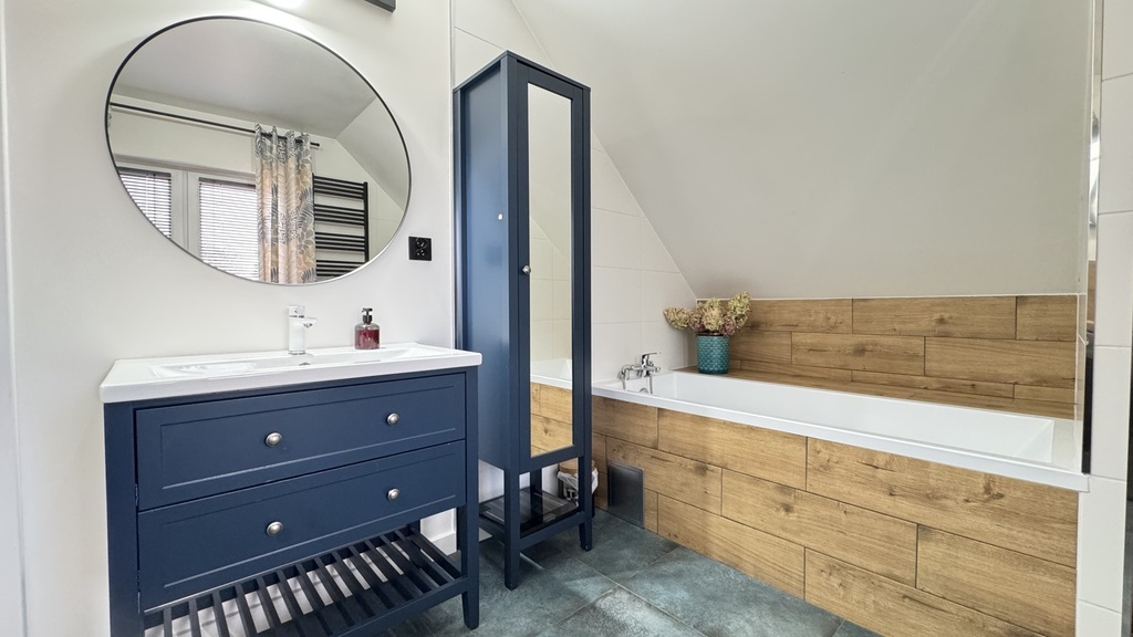 Na piętrze czekają sypialnie z drewnianymi sufitami i skosami nadającymi im przytulny, skandynawski klimat. Każdy pokój wyposażony w szafy pod zabudowę, a na korytarzu dodatkowa zabudowa garderobiana — przestrzeń do przechowywania przemyślana do ostatniego centymetra. Łazienka na piętrze zachwyca granatową szafką z umywalką, wanną obudowaną płytkami drewnopodobnymi— projekt z wizją. Tu też znajdziemy pralkę i suszarkę, wbudowane w przestrzeń łazienki.