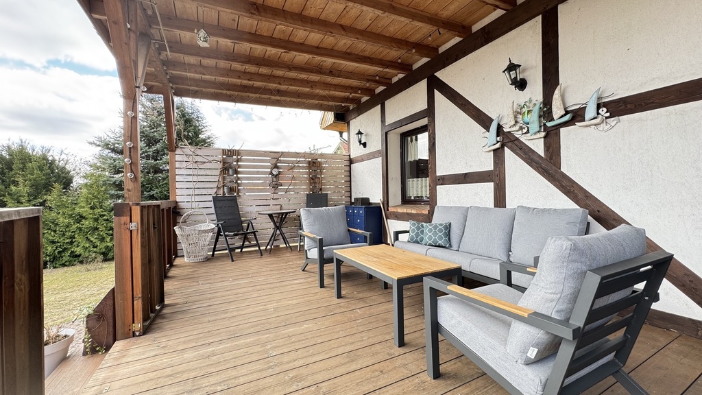 Zadaszona weranda to jeden z największych atutów tego domu — obszerna, w pełni zadaszona drewnianą konstrukcją, dostępna bezpośrednio z salonu przez przeszklone drzwi. Miejsce stworzone do życia na zewnątrz: meble ogrodowe zapraszają do relaksu, nastrojowe oświetlenie działa przez cały wieczór, a dach chroni przed deszczem niezależnie od pogody. Tu przy kawie można obserwować jezioro, a przy kolacji — zachód słońca. Taras płynnie łączy wnętrze domu z ogrodem i sprawia, że sezon "na zewnątrz" trwa tu znacznie dłużej niż gdziekolwiek indziej.