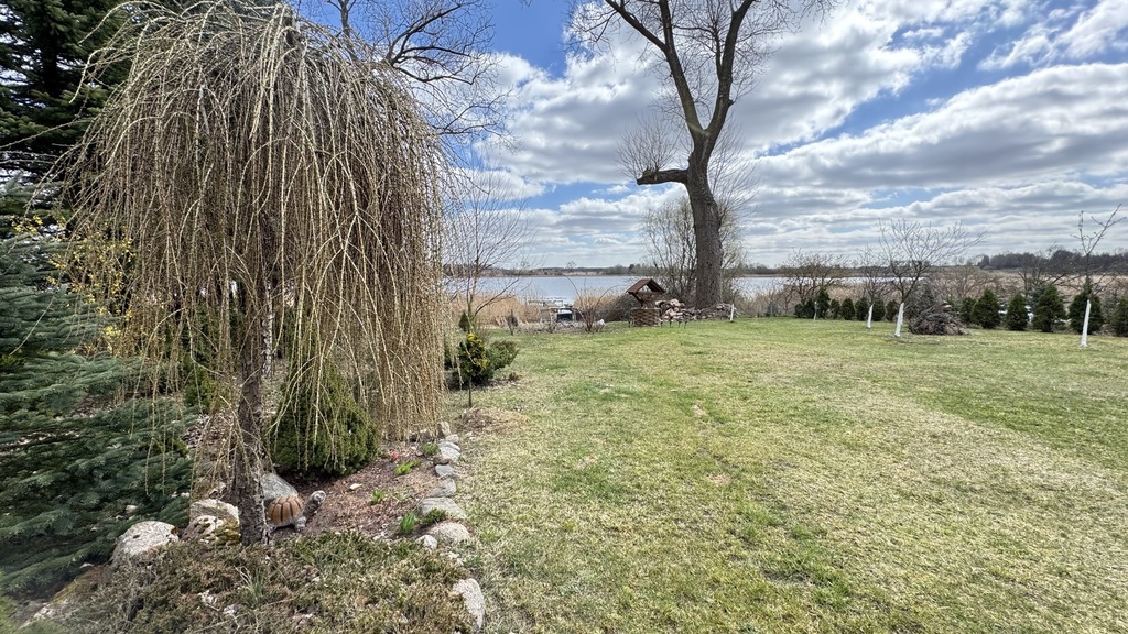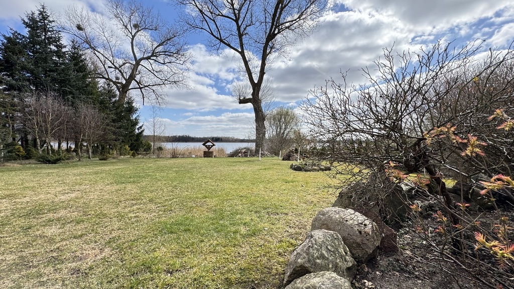 Rozległa, zadbana działka schodzi bezpośrednio ku brzegowi jeziora Szadzko. Własne zejście do wody, pomost, miejsce na kajak lub łódkę — tu wakacje trwają przez całe lato. Płaczące brzozy, stare drzewa, studnia ozdobna i alejki z kamienia tworzą ogród jak z bajki. Dopełnieniem jest wiata garażowa na dwa samochody.