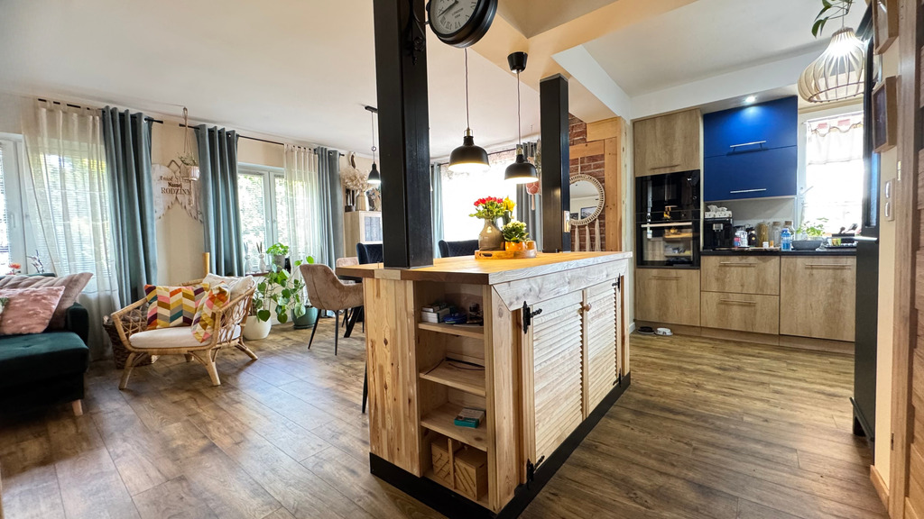 Wybudowany w 2014 roku budynek o charakterze rustykalnym z duszą — drewniana zadaszona weranda z miejscem do wypoczynku na świeżym powietrzu, brukowany dziedziniec i starannie utrzymany ogród pełen drzew, krzewów i małej architektury. Dom oferuje 99,7 m² powierzchni użytkowej, do której dochodzi w pełni zagospodarowana piwnica o powierzchni 52,90 m² — łącznie ponad 150 m² przestrzeni do życia i gospodarowania. Stosunkowo młody wiek budynku to gwarancja nowoczesnych instalacji i komfortu bez niespodzianek. To nie jest dom "z katalogu" — to dom z charakterem i klimatem, który zostaje z Tobą długo po wizycie.