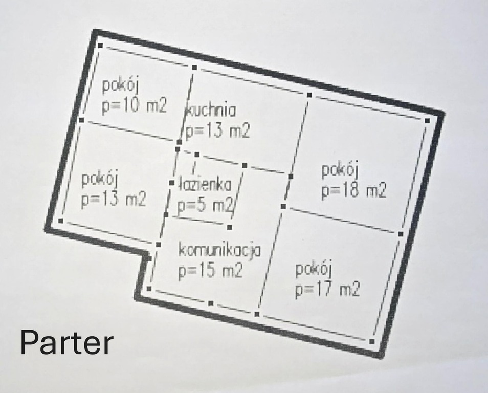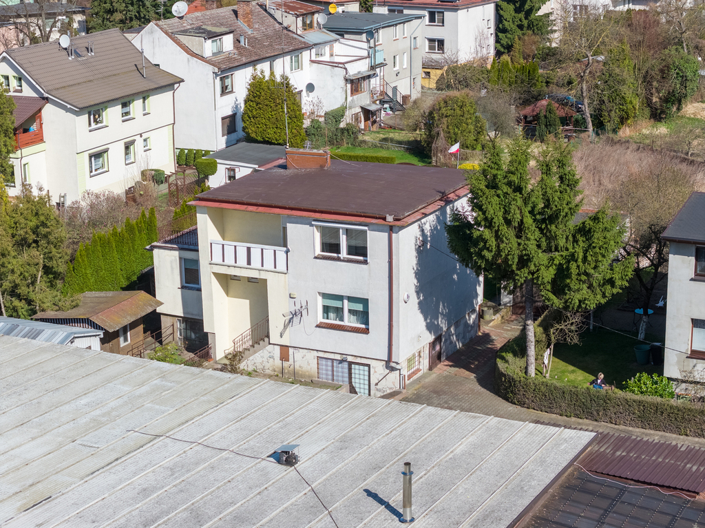 Aktualnie nieruchomość przystosowana jest dla dwóch rodzin, a budynek posiada dwa wejścia. Powierzchnia użytkowa domu to 107 m2 a całkowita 198 m2. W skład budynku wchodzą: