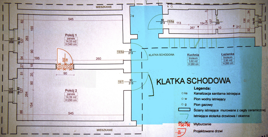 UWAGA: Kuchnia i łazienka (połączone amfiladowo) znajdują się za drzwiami frontowymi do lokalu, z wejściem z klatki schodowej (ale na tym samym piętrze co pokoje). Układ funkcjonalny mieszkania przedstawia rzut.