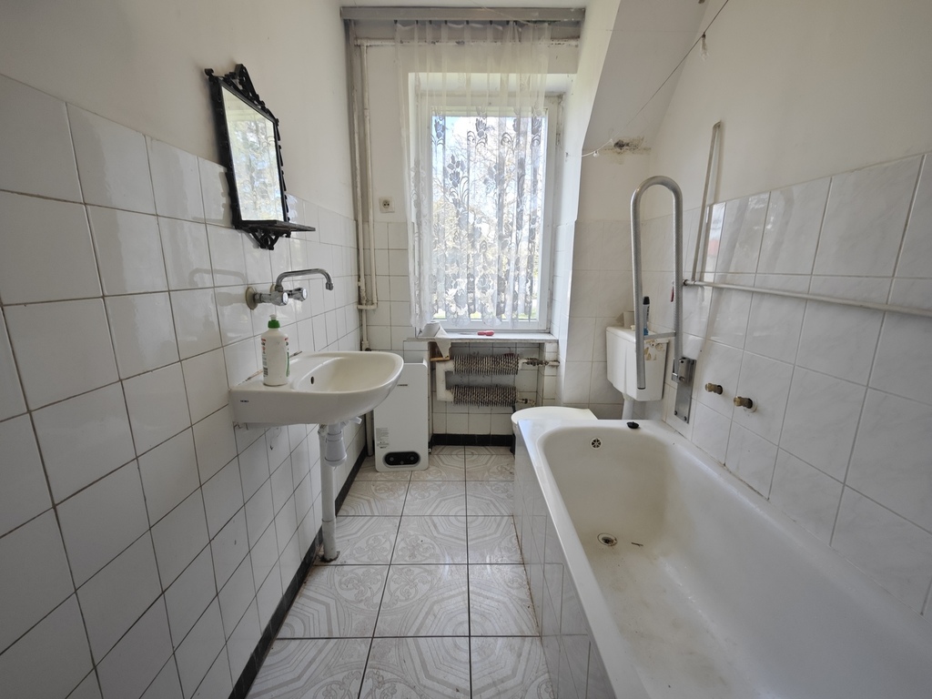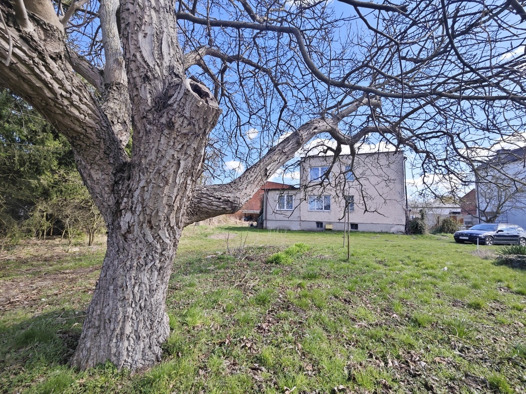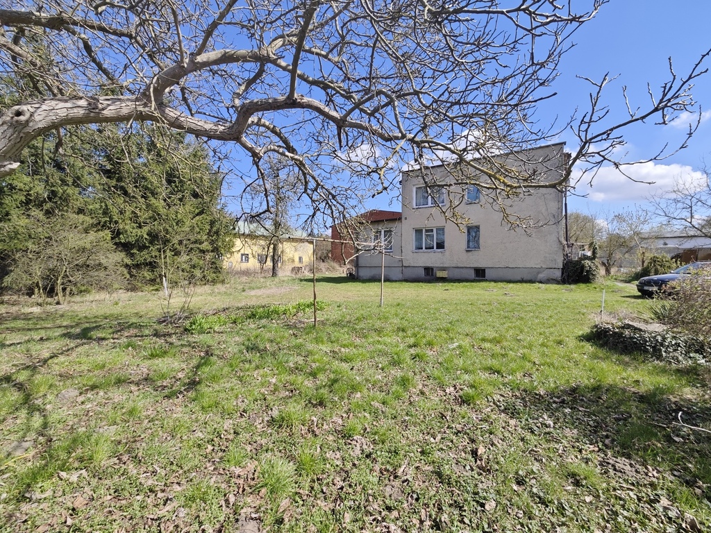 Dom znajdujący się na działce wybudowany został w 1973 roku. Powierzchnia użytkowa domu to 110m2, na którą składa się parter (trzy pokoje, kuchnia, łazienka i hol) oraz piętro (dwa pokoje, kuchnia, łazienka i hol). Cały dom jest dodatkowo podpiwniczony. W poziomie piwnicznym znajduje się między innymi garaż w bryle budynku. Dom posiada pełne uzbrojenie. Parter - cegła pełna 24x12, piętro - suporex. Stropy Kleina. Dach płaski pokryty papą. Dom przeznaczony jest do kapitalnego remontu lub całkowitej przebudowy. Istnieje możliwość bardzo dużej rozbudowy budynku do około 530m2 powierzchni zabudowy (obecnie niecałe 85m2 powierzchni zabudowy).