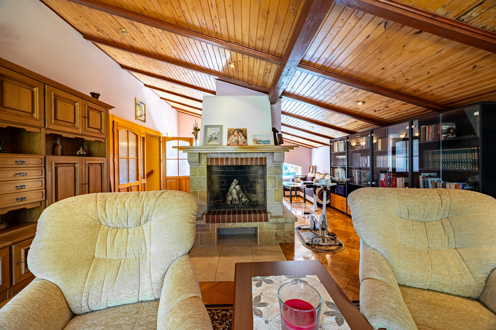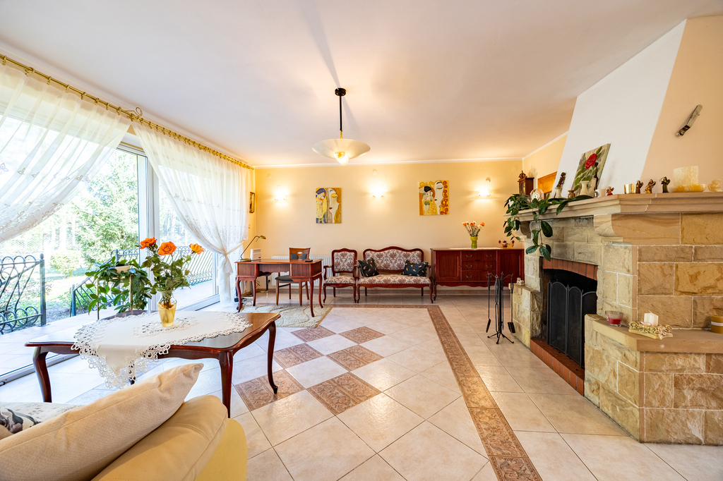 - salon z kominkiem oraz wyjściem na taras i ogród ok. 30m²,