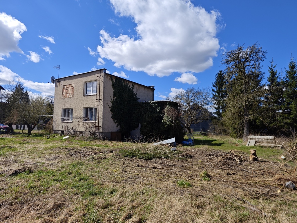 Dom znajdujący się na działce wybudowany został w 1973 roku. Powierzchnia użytkowa domu to 110m2, na którą składa się parter (trzy pokoje, kuchnia, łazienka i hol) oraz piętro (dwa pokoje, kuchnia, łazienka i hol). Cały dom jest dodatkowo podpiwniczony. W poziomie piwnicznym znajduje się między innymi garaż w bryle budynku. Dom posiada pełne uzbrojenie. Parter - cegła pełna 24x12, piętro - suporex. Stropy Kleina. Dach płaski pokryty papą. Dom przeznaczony jest do kapitalnego remontu lub całkowitej przebudowy. Istnieje możliwość bardzo dużej rozbudowy budynku do około 530m2 powierzchni zabudowy (obecnie niecałe 85m2 powierzchni zabudowy).