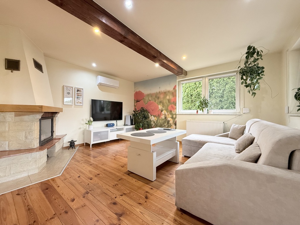 - jasny salon z kominkiem i wyjściem na taras