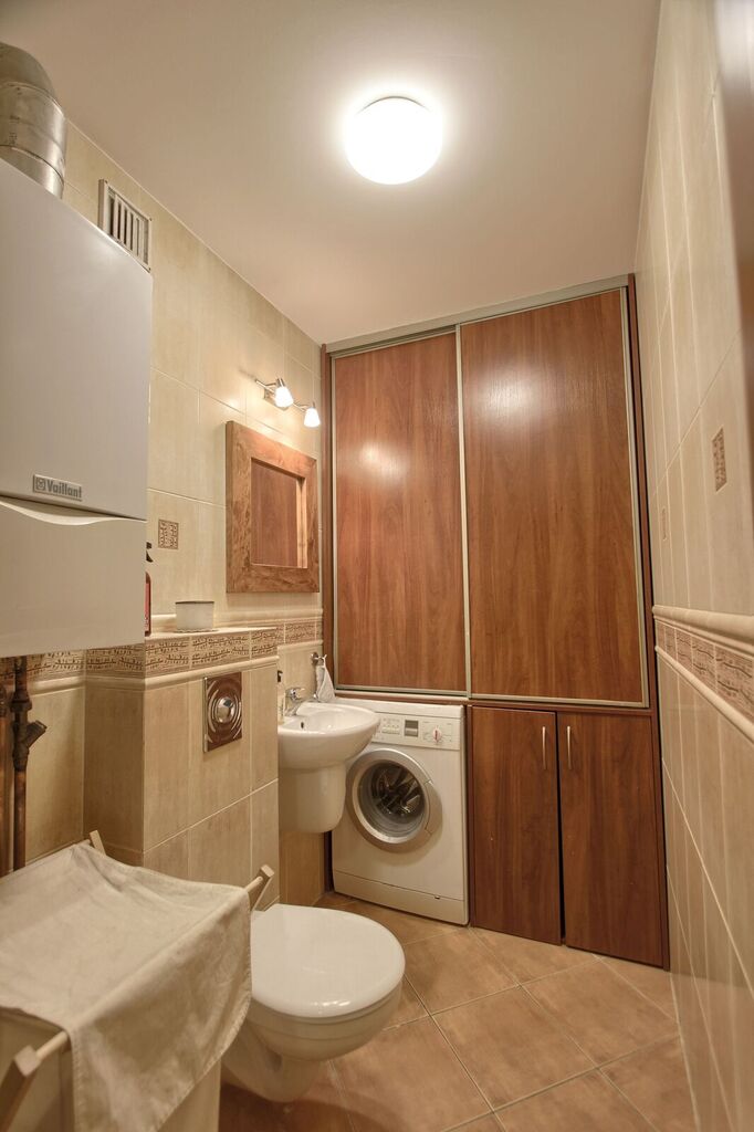 Z salonu wyjście na balkon, duża łazienka z wanną i prysznicem, w drugiej łazience wc i pralka.