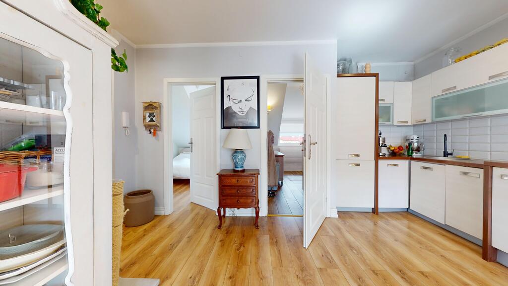 Mieszkanie składa się z 4 ustawnych pokoi, kuchni, łazienki oraz aż trzech garderób, co znacząco zwiększa komfort codziennego życia i rozwiązuje problem przechowywania.
