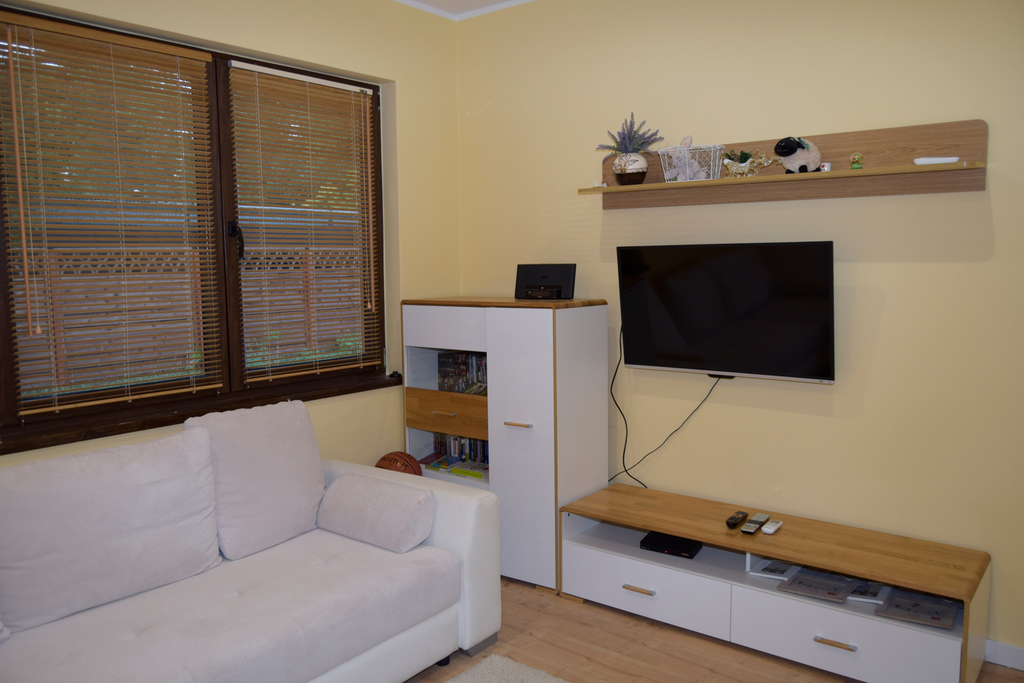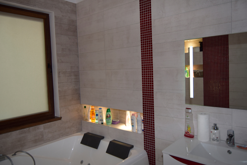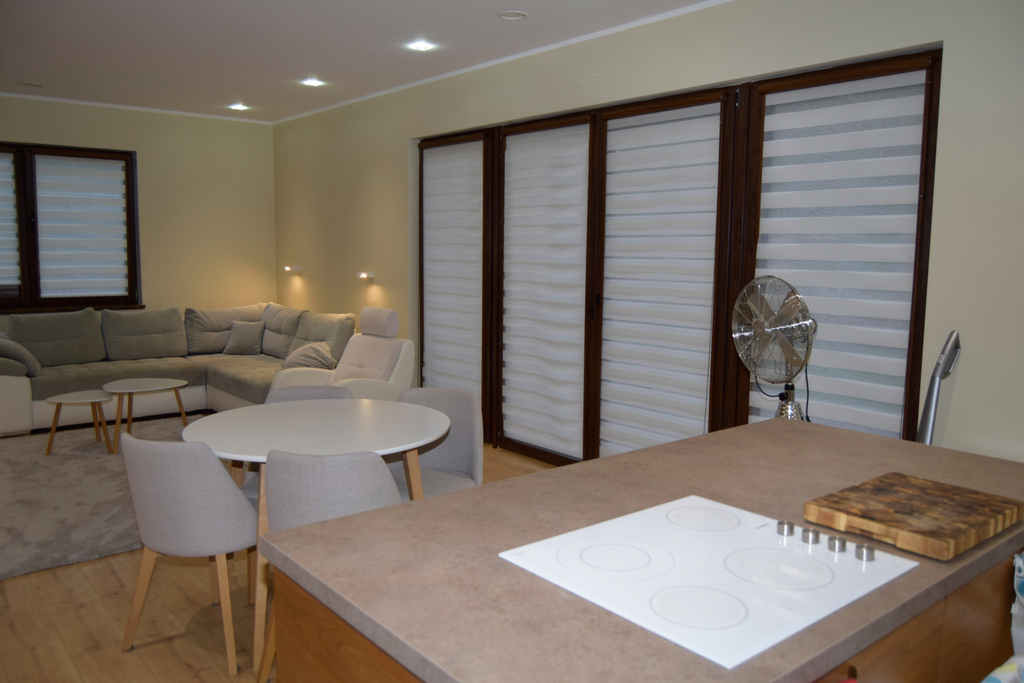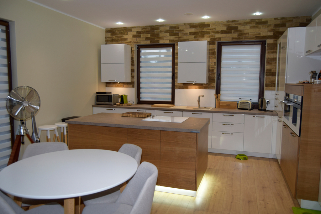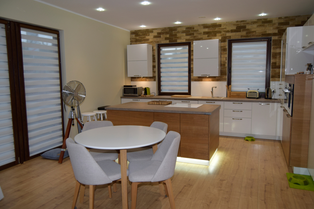 Kuchnia w zabudowie na wymiar z nowoczesnymi sprzętami marki Siemens. Ogrzewanie i ciepła woda pochodzą z wydajnej pompy ciepła marki Vaillant, a w domu rozprowadzono ogrzewanie podłogowe. Dodatkowym atutem, który wpływa na ekonomię utrzymania domu jest zastosowana rekuperacja oraz klimatyzacja marki LG. Okna PCV, ściany gładkie i malowane, łazienka i toaleta w ładnej i stylowej glazurze i terakocie.