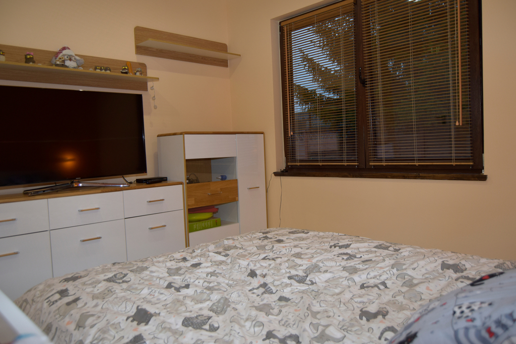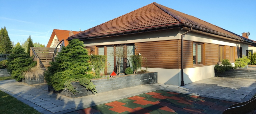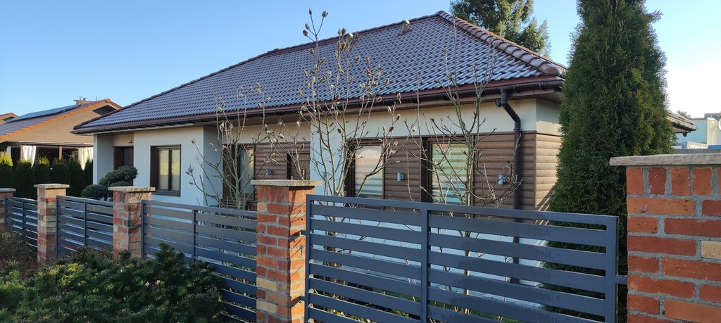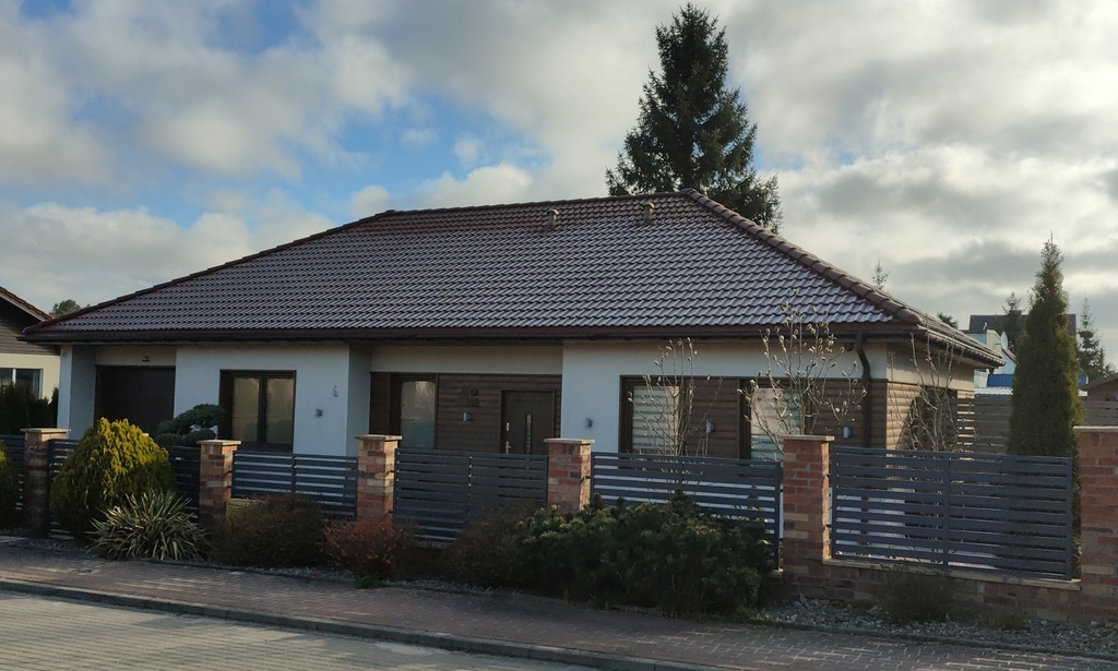 Dom parterowy, posadowiony na działce o powierzchni 678m2, wybudowany w 2016 w konstrukcji szkieletowej z dachem pokrytym dachówką cementową. Powierzchnia użytkowa tego domu to 138m2 i składa się z dwóch stref - dziennej i nocnej. Strefa dzienna składa się z otwartej przestrzeni salonu i kuchni o łącznej powierzchni ok. 40m2, strefa nocna to 3 spore sypialnie w kształcie kwadratu, łazienka oraz garderoba. W domu znajdują się również pralnia, kotłownia i duży garaż (ok.19m2).