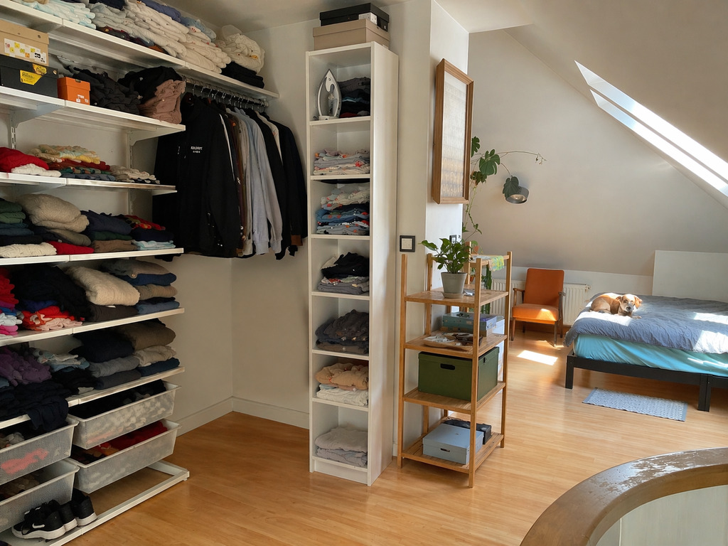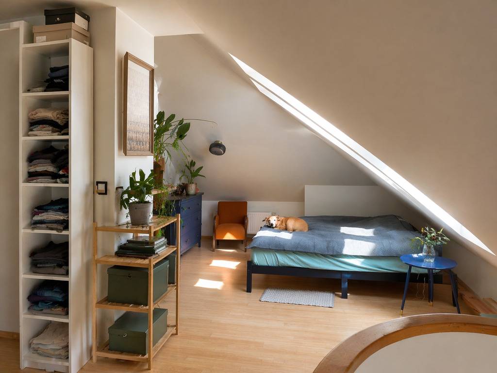 • otwarta przestrzeń sypialniana z garderobą (36 m² pow. całkowitej) – parkiet bambusowy