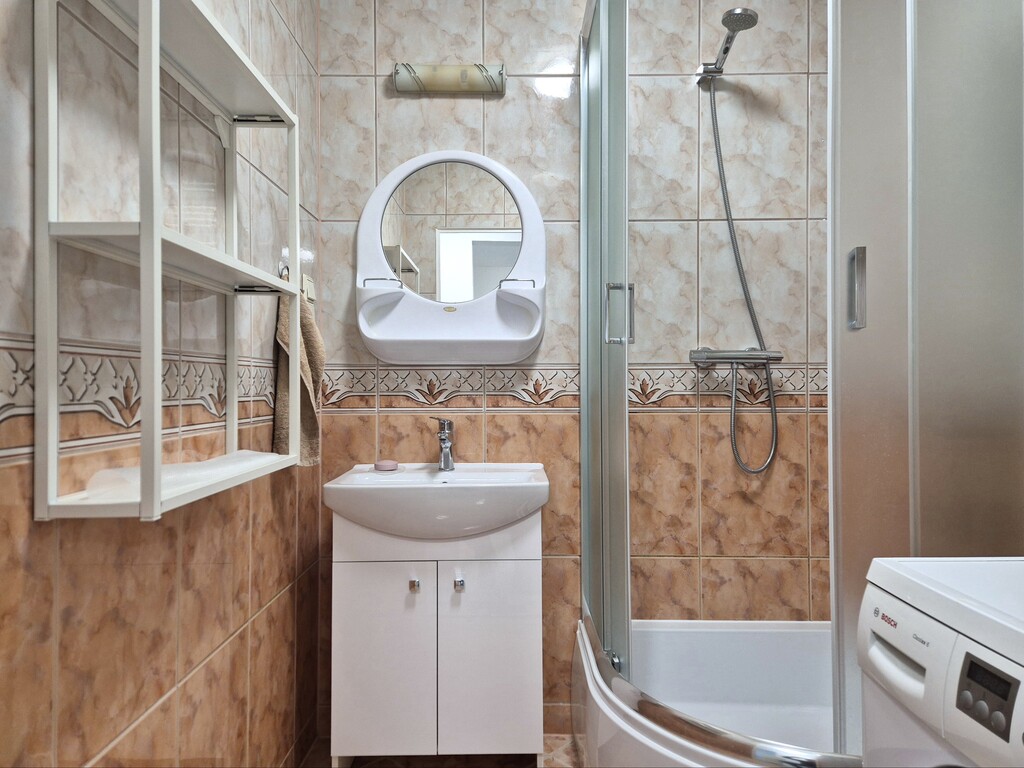- Łazienka z kabiną prysznicową, umywalką oraz pralką
