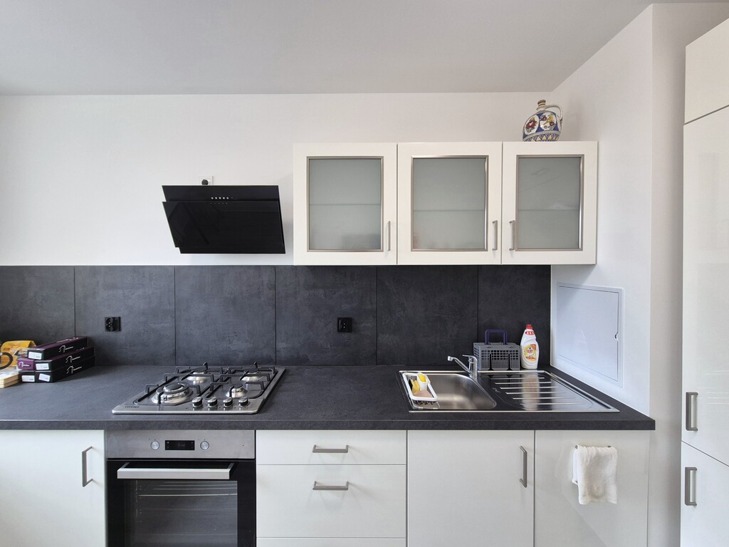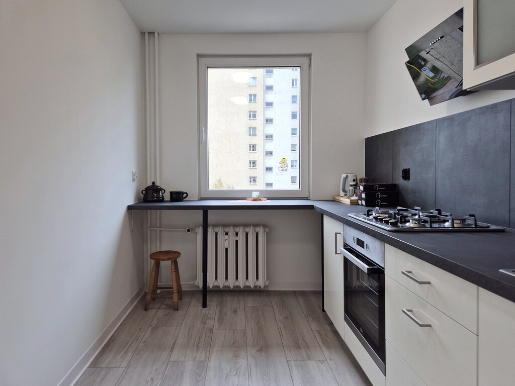 - Widna kuchnia po całkowitym remoncie – nowe meble. W kuchni znajduje się kuchenka gazowa z piekarnikiem, okap oraz lodówka