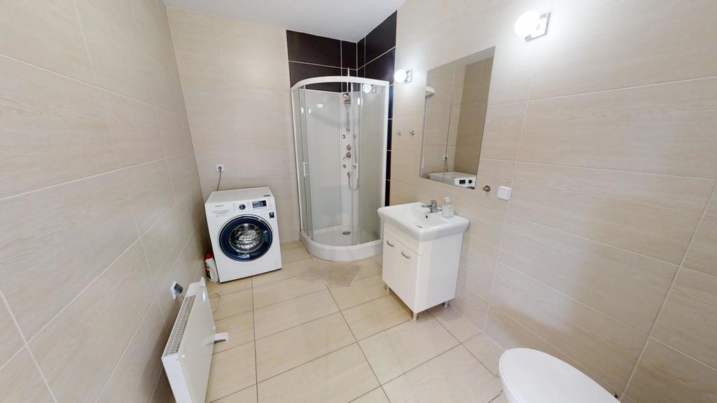 • duża łazienka (ok. 7m2)z kabiną prysznicową, WC, pralka,