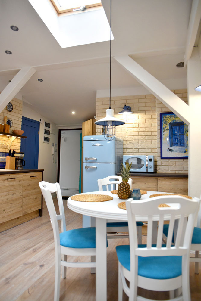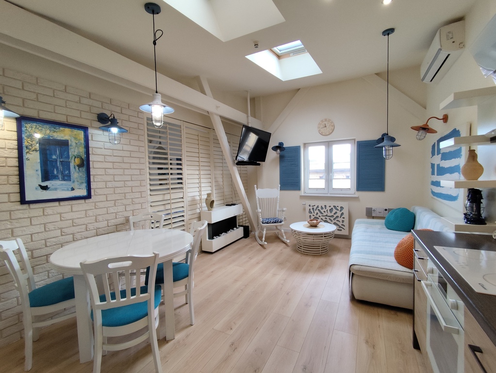 Na wynajem klimatyczne i nowoczesne mieszkanie o powierzchni 43,26 m², urządzone w radosnej biało-niebieskiej kolorystyce.